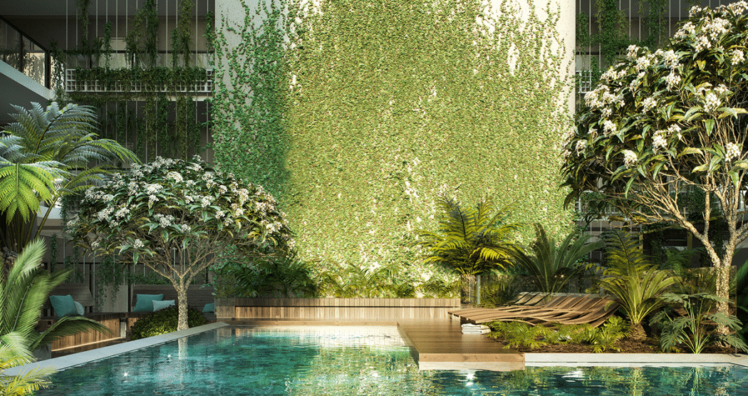 External aluminium blade feature screens have commenced installation along with rooftop landscaping.