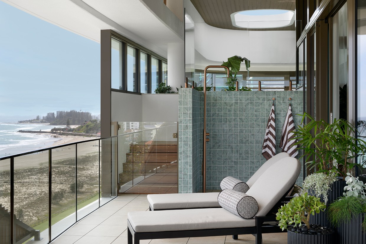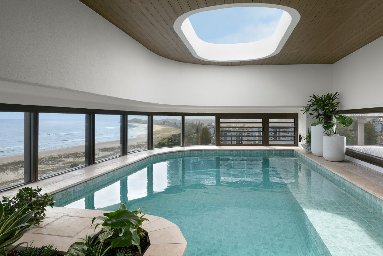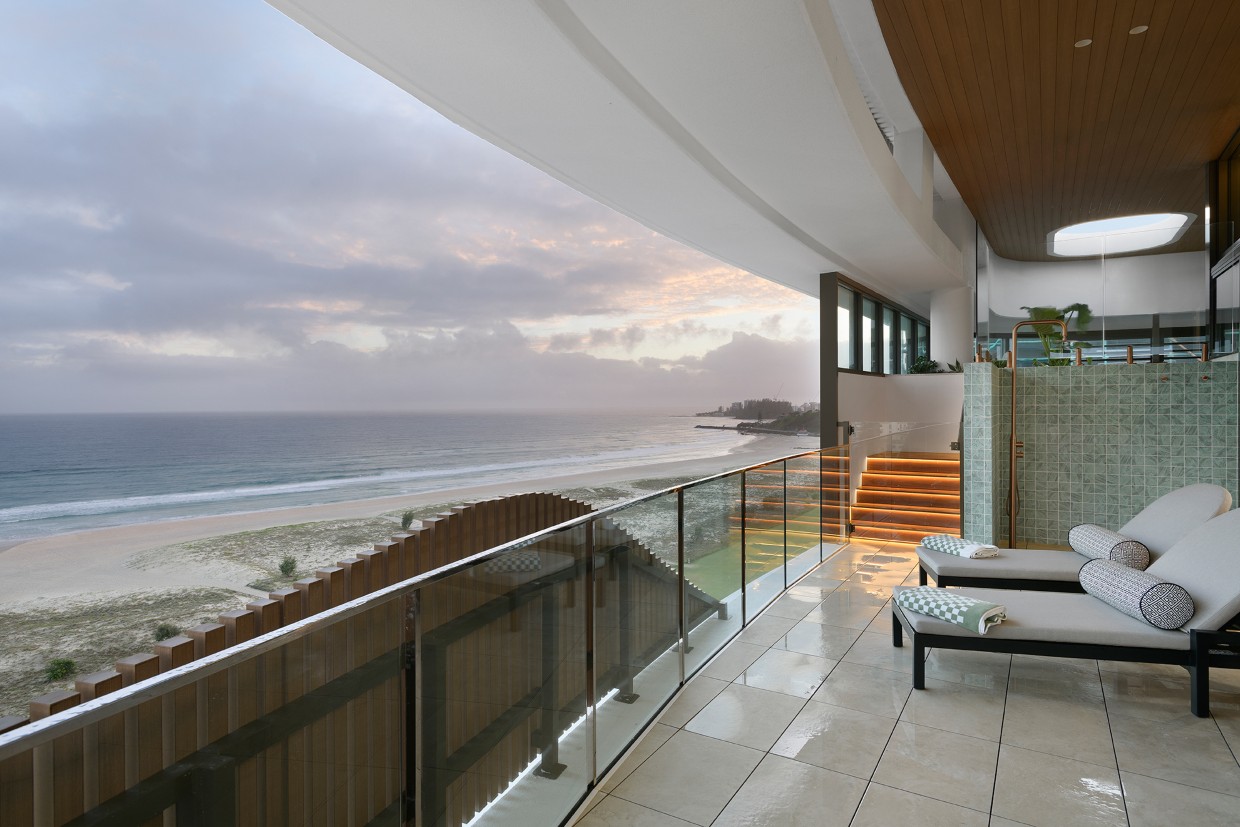 Construction of the SUR building at Kirra Beach has been completed, with the two-level penthouse having 13-foot high ceilings and beach frontage going on the market, with an expressions of interest campaign launched.