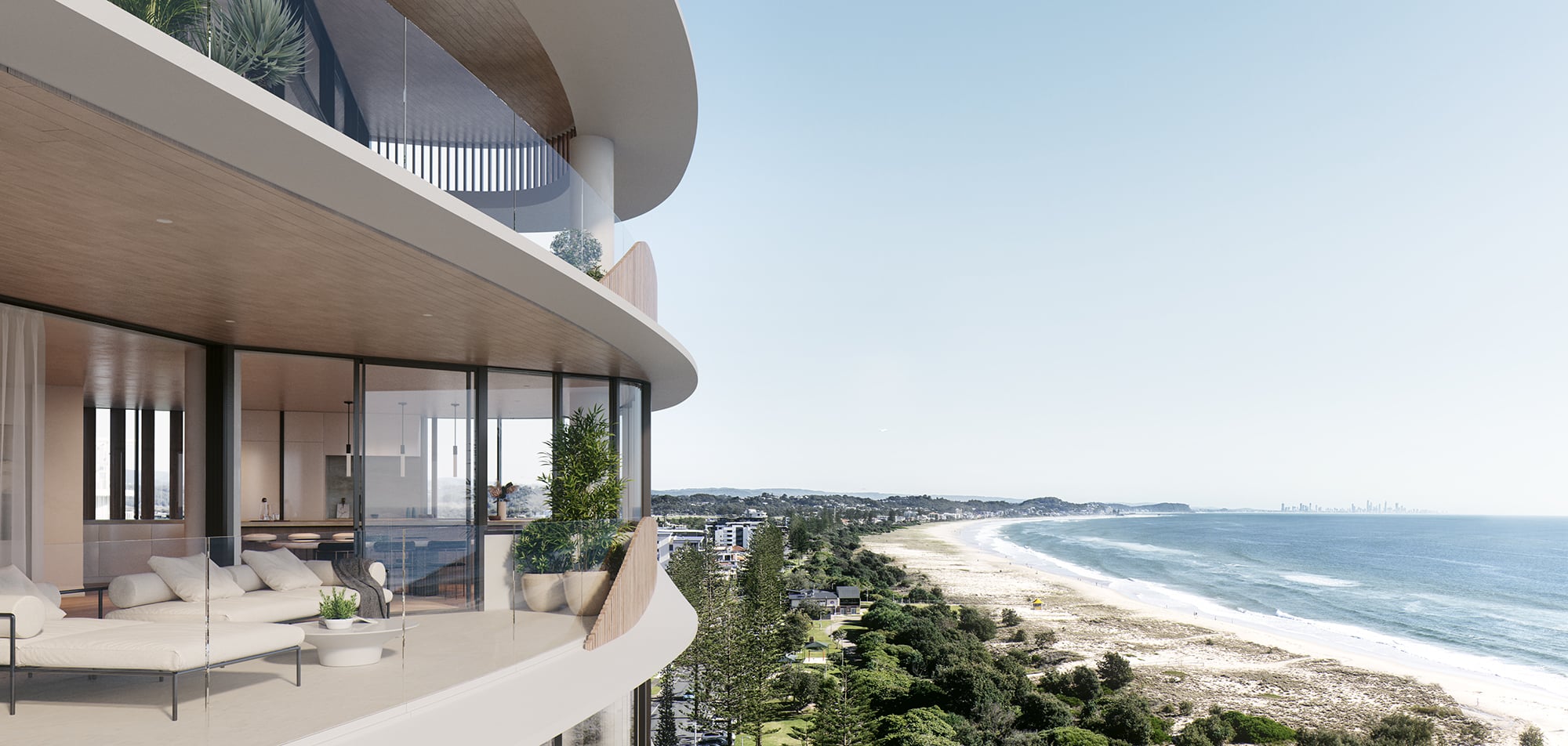 Both Kirra and Rainbow Bay were the catalyst in the design inspiration. The natural land and ocean formation of soft curves, texture, colour, and movement were all key driving elements in composing SUR. The curved lines of the façade, large expansive glazing framing views to the beach and skyline, the soft tone and warmth of the coastal material and colour palette blend beautifully with the Kirra landscape. The organic spandrel that fluidly moves up and down lightly touching parts of the timber screen are an expression of the ocean water lapping in and out along the soft sandy Gold Coast beaches.